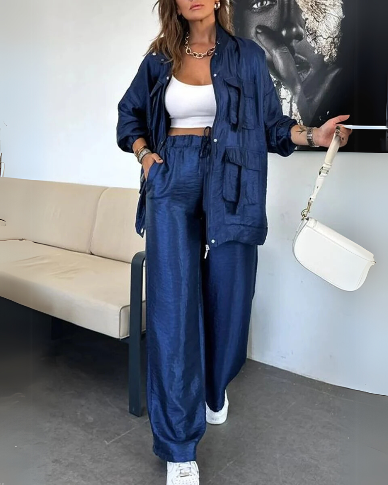 This sleek matching set redefines off-duty elegance. The silky texture and relaxed silhouette make it ideal for confident daywear or elevated lounging. With utility-inspired pockets and a rich blue hue, it’s designed to make a statement while keeping you ultra-comfortable.