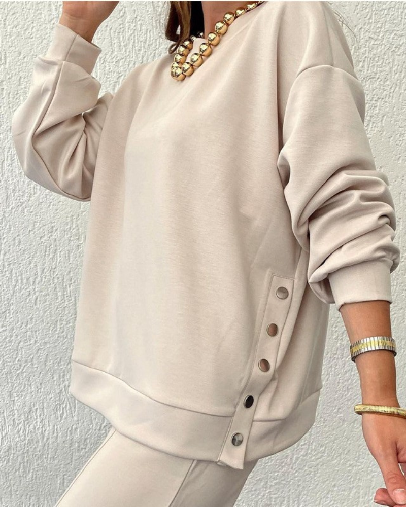 This elegant two-piece suit is designed for the modern woman who seeks both sophistication and ease in her wardrobe. The jacket has buttons down the front and adds a touch of sophistication to the whole look.