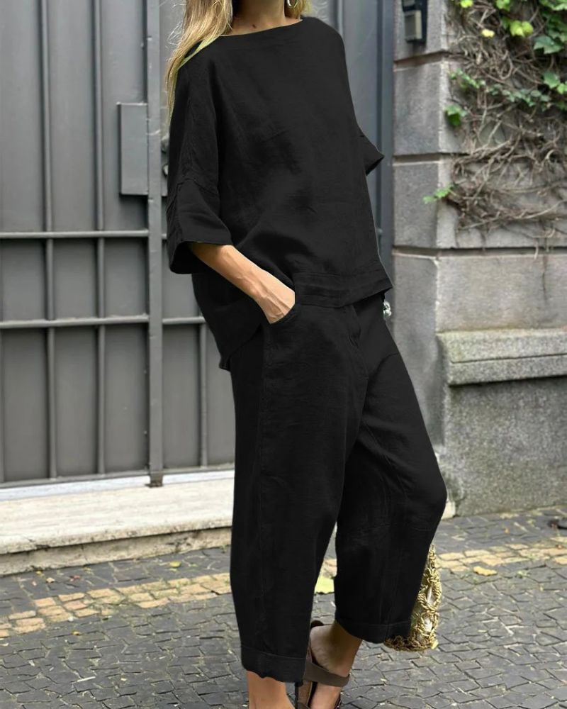 Elevate your summer wardrobe with the set, offering both comfort and effortless elegance. The loose-fitting top and relaxed pants provide a chic yet laid-back look, making it a versatile addition to your wardrobe.