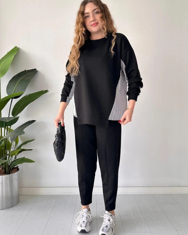 Featuring a modern, oversized sweatshirt with chic colour-blocked panelling, this set exudes sophistication while keeping you comfortable. The matching tapered trousers add a sleek, tailored touch, making it easy to dress up or down for any occasion.