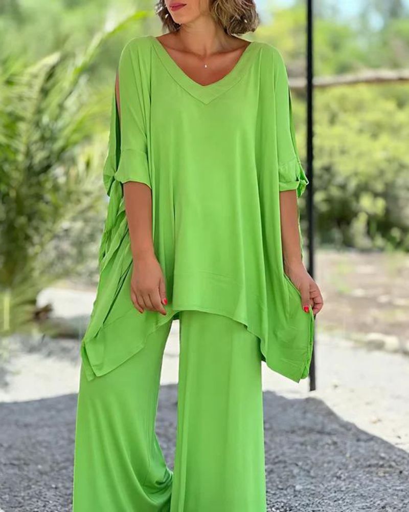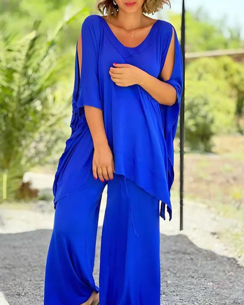 This 2-piece set features a peek-a-boo shoulder top that adds a touch of sexy and sophistication to your outfit. The fabric is not only soft against the skin, but also has a relaxed fit so you can move with ease.