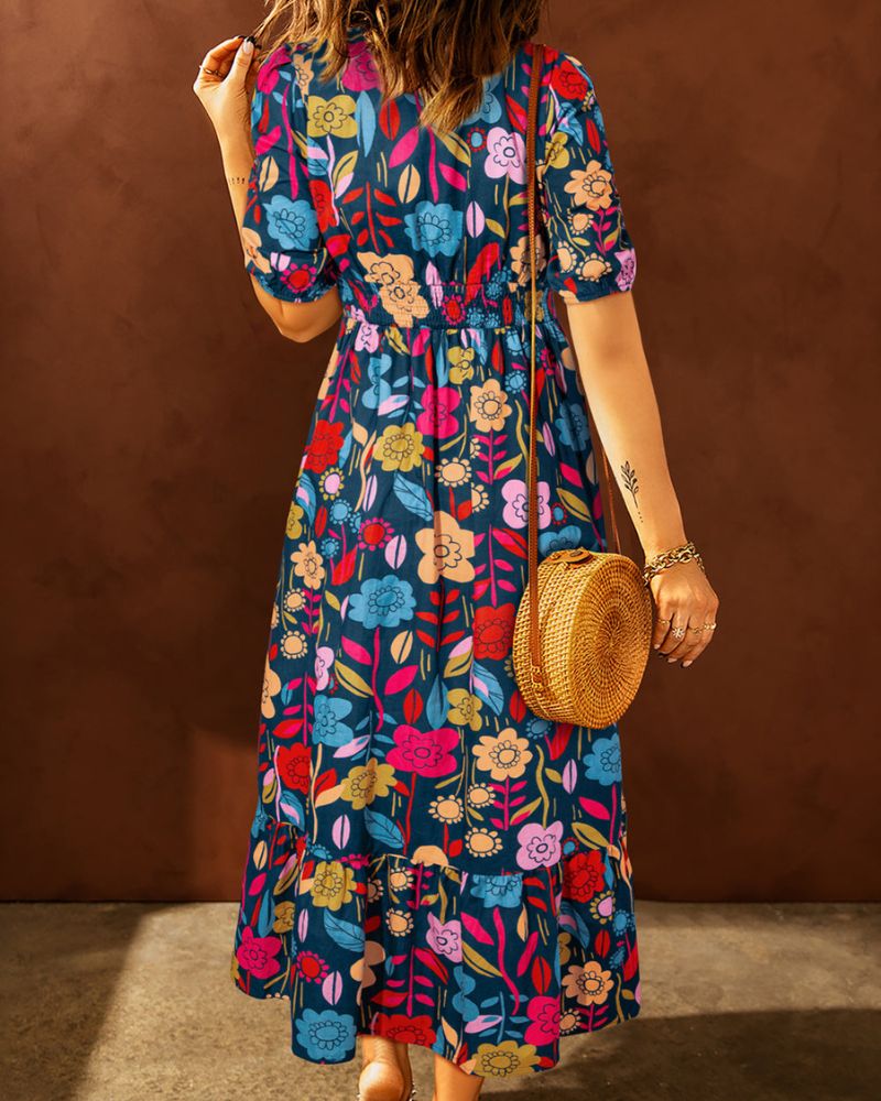 a stunning blend of retro elegance and modern comfort. This long dress features a captivating floral print and an elegant silhouette that evokes a sense of vintage allure.