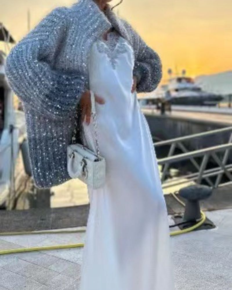 A chic and stylish addition to your wardrobe, perfect for adding a touch of glamour to your everyday look. This sweater features a flattering V-neckline adorned with subtle sequins, offering a blend of casual comfort and elegant sparkle.