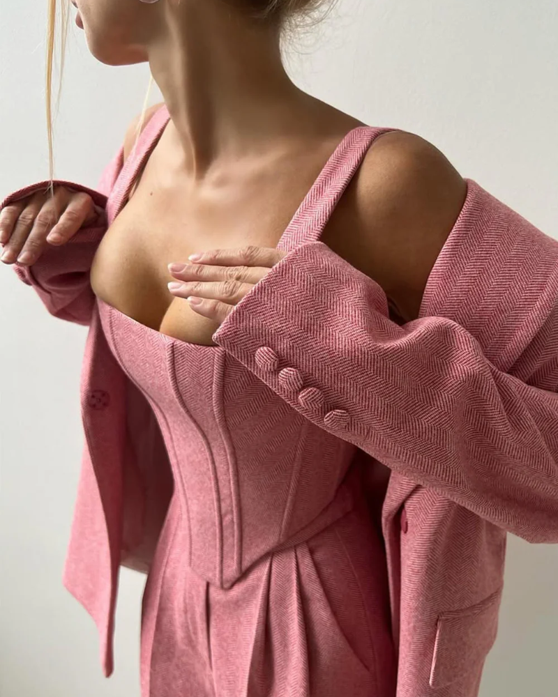 Step into your next big event with grace and confidence in this stunning 3-piece suit. Designed with impeccable tailoring, this suit brings together a classic double-breasted blazer with flattering, high-waisted trousers for a polished, sophisticated look.